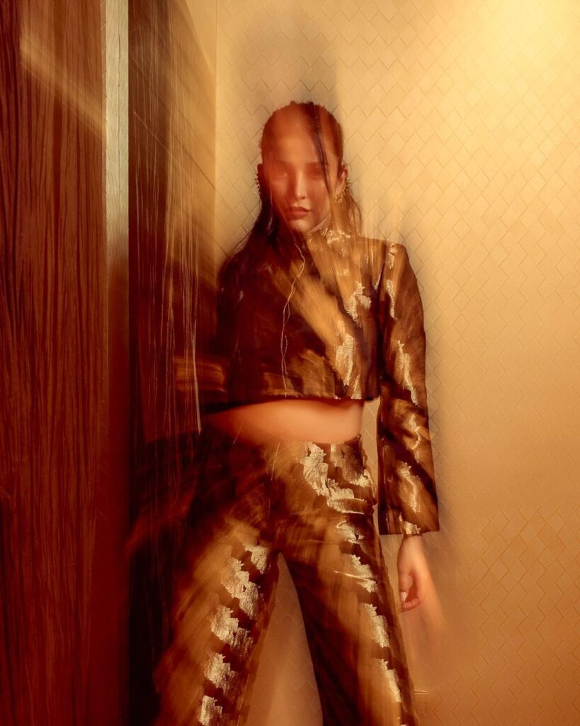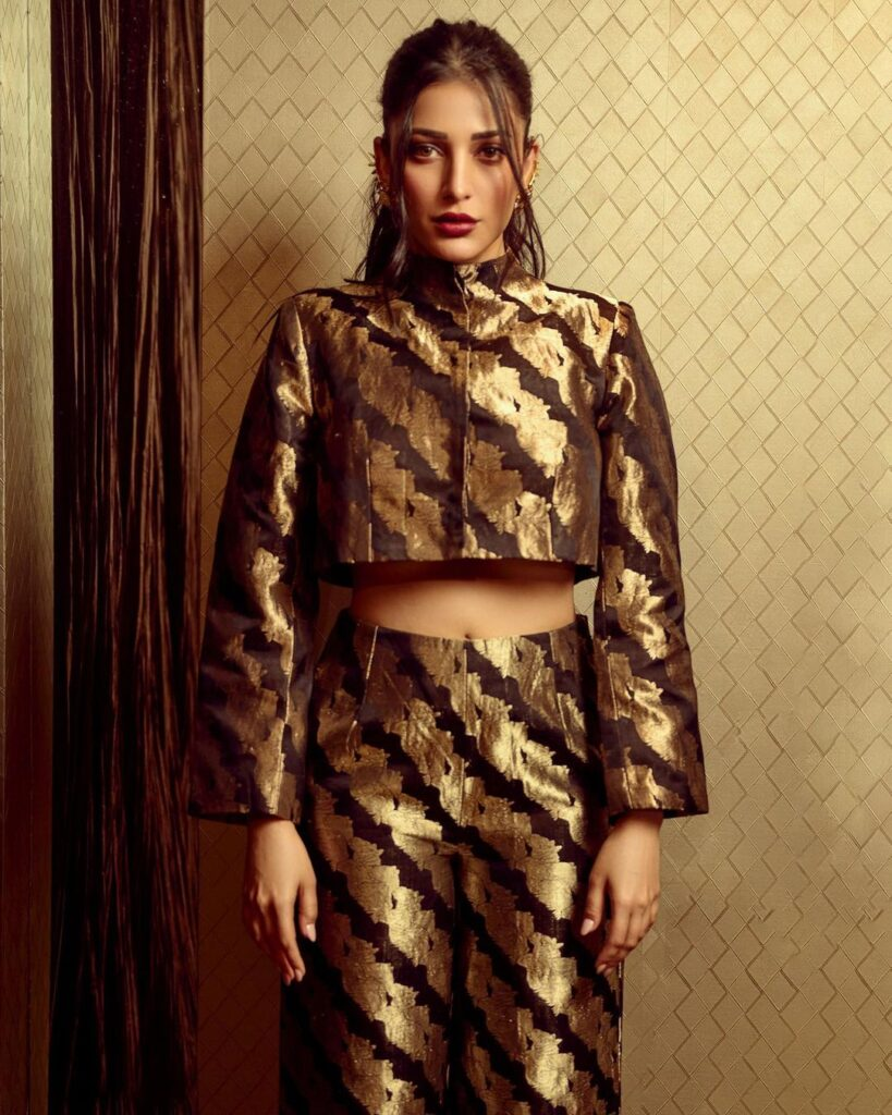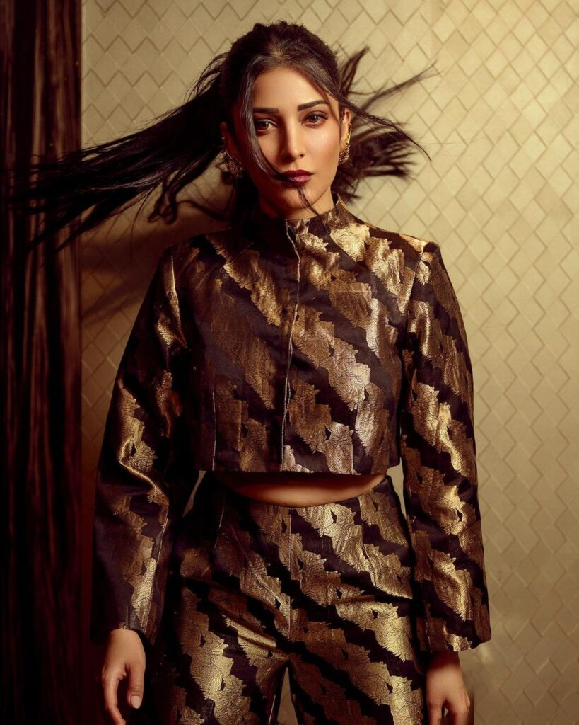 Shruti Haasan is raising heads once more with her gorgeous fashion choices! In a recent shot, she oozes sheer glamour in a brown and gold co-ord set that seamlessly blends earthy tones with glittering shimmer. The ensemble's elaborate design is visually appealing, with delicate patterns and textures lending depth and character. Her posture is both fun and composed, emphasising the stylish silhouette of the clothing. The high boots provide an edge to the whole outfit, while remaining fashionable.