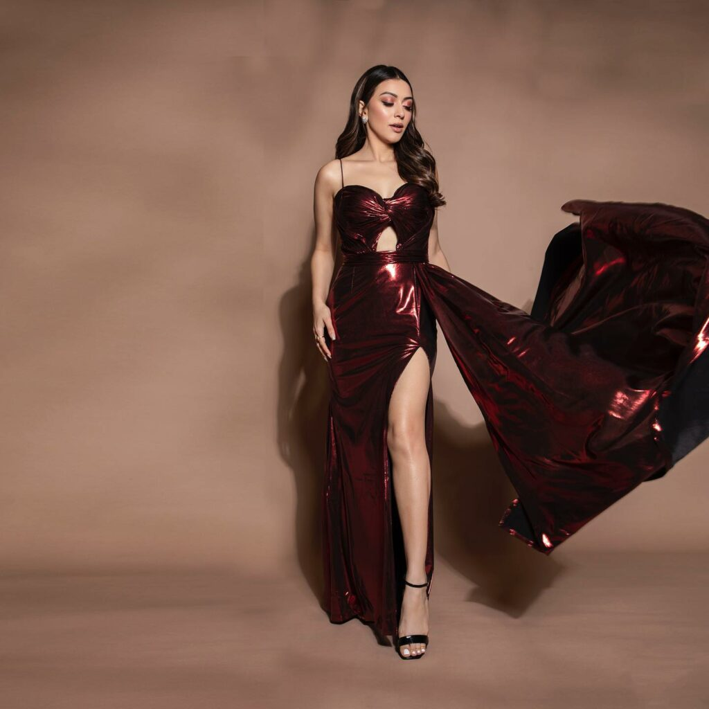 A high split and a floor-length trail that descends from the waist are further features of the floor-length metallic gown. Shuvali Awasthy was the designer of the outfit. Hansika improved the eye feast in addition to her thigh-high split with her sweetheart neckline, a cut-out in the front, and of course the noodle straps. What a sexy expression Hansika is giving. Two of Hansika's films are ready for release, and five more are still under production. She will appear in 105 minutes, and my telugu name is Shruthi.
